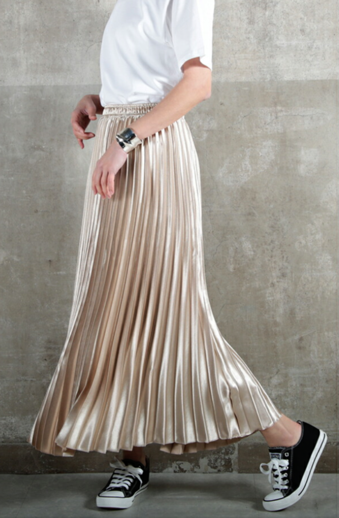 上質な綿素材のベージュプリーツスカート(丈60cm)にベージュのスニーカーを合わせたコーデ。トップスは白のシンプルなカットソー。同系色でまとめることで統一感が出て、ミモレ丈だからこその上品さが引き出されます。