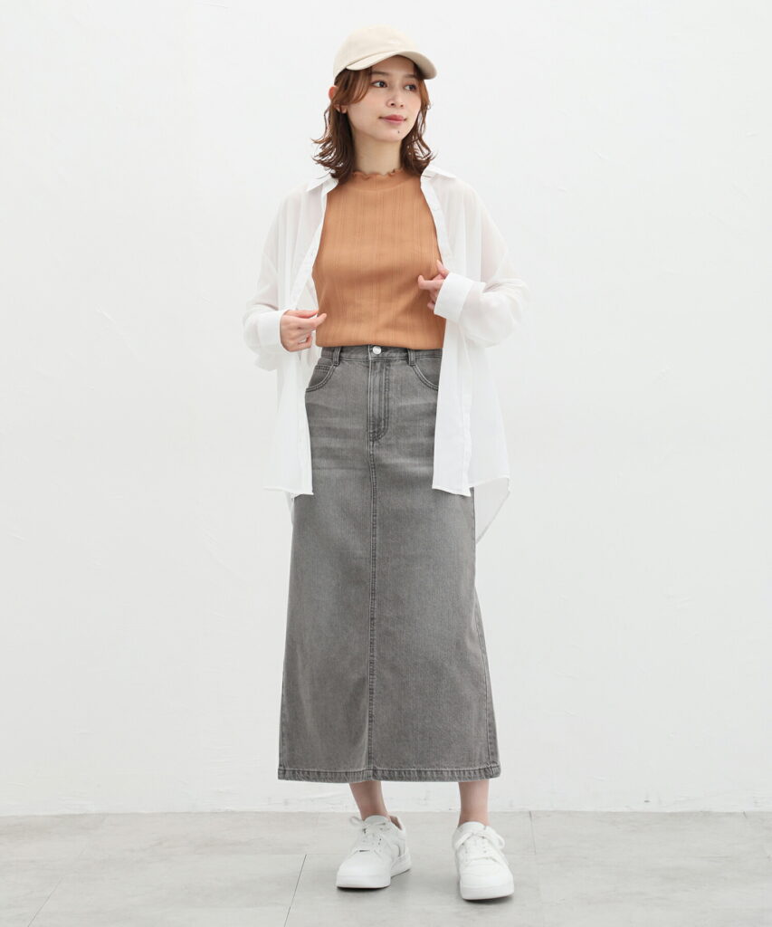 デニムスカートは、どうしても脚を強調するアイテムです。だからこそ、トップスはすっきり、スカートはストレートなシルエット、足元もシンプルにまとめることで、全体的に縦のラインが強調されます。