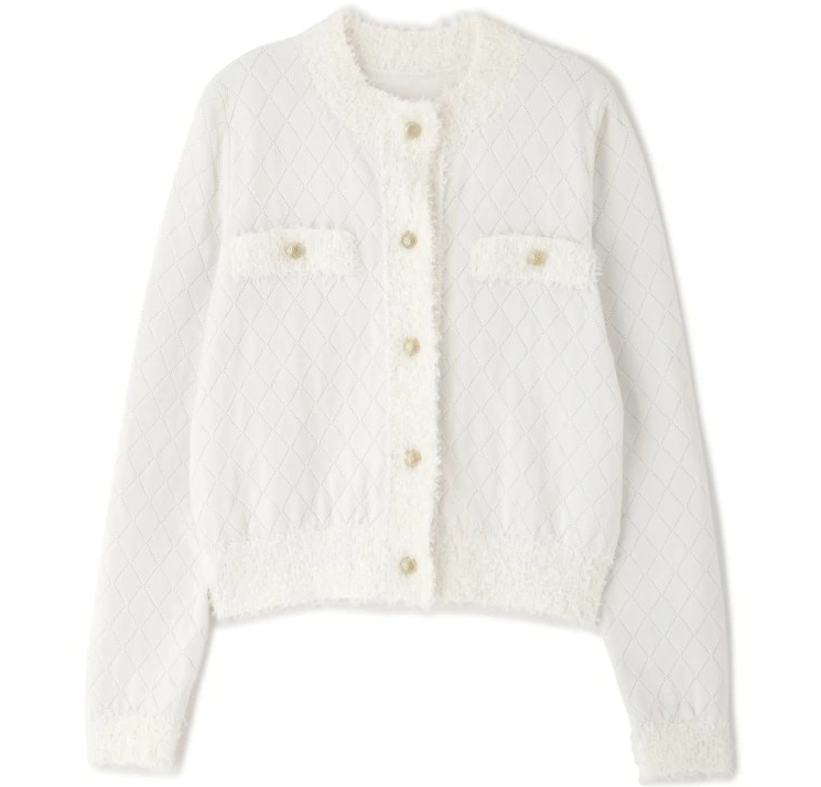 - アイテム: ホワイトのラメツイードカーディガン